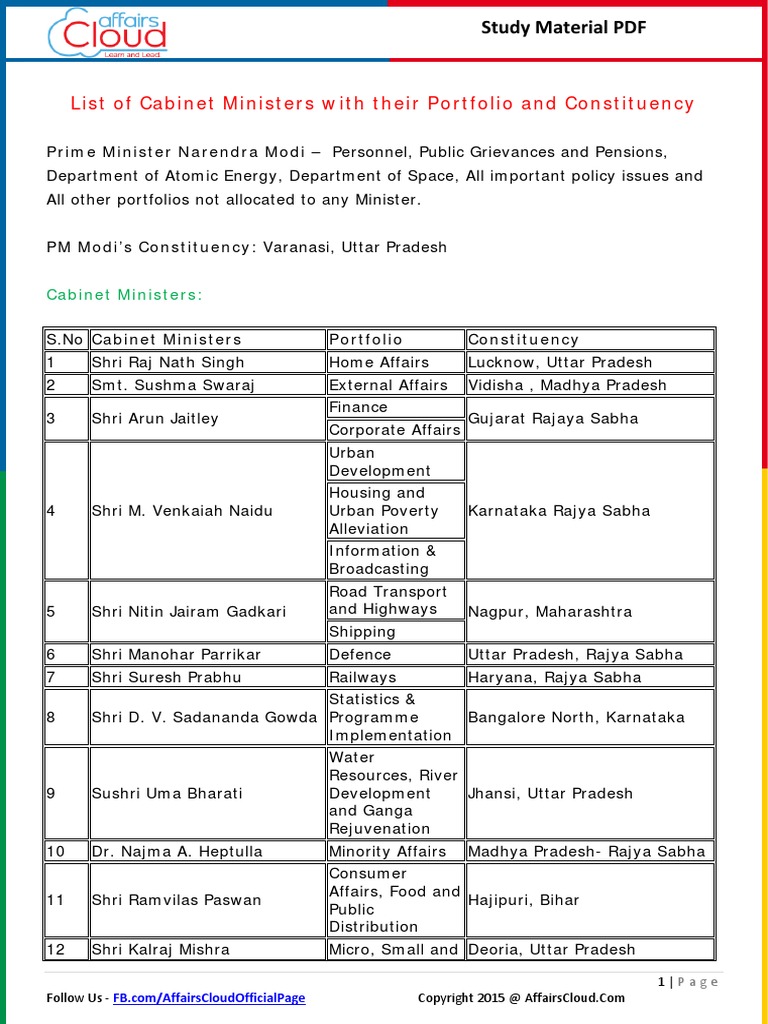 Cabinate Minister List / Modi Cabinet 2 0 Here S The Full List Of The New Union Council Of Ministers Rvcj Media - Minister of urban development & housing.